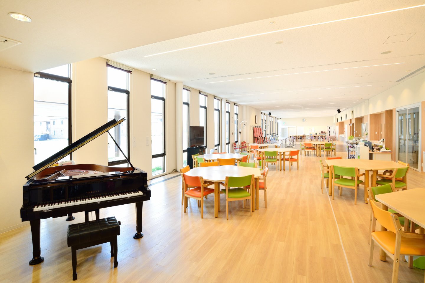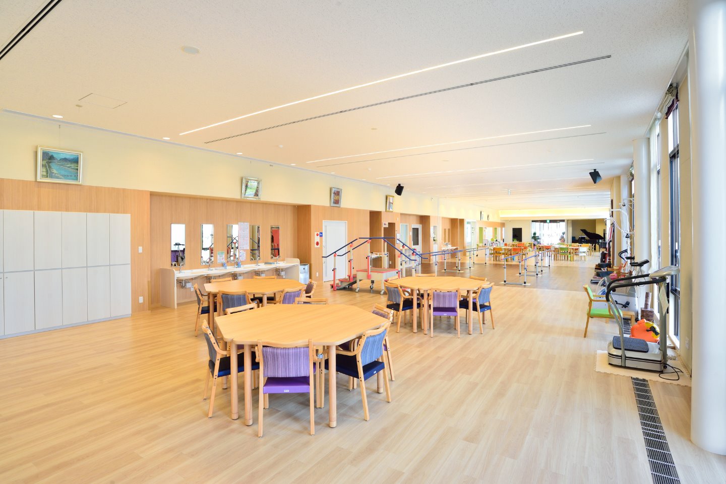 広々とした空間でリハビリを行っています。 端から端まで40mあり、歩行訓練をしっかりと行える広さです。