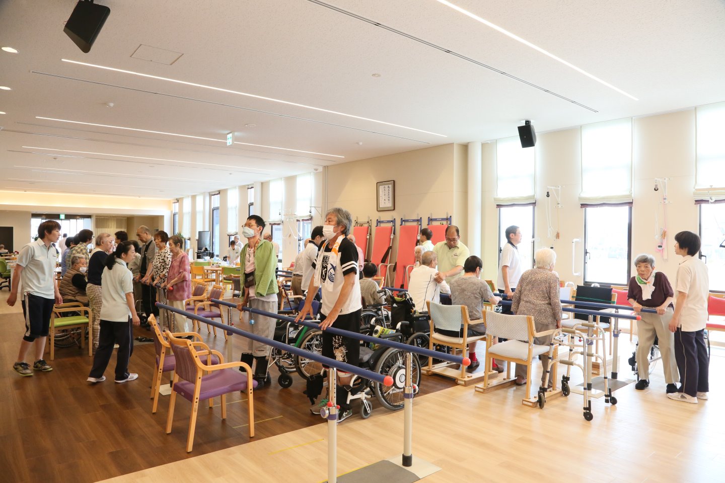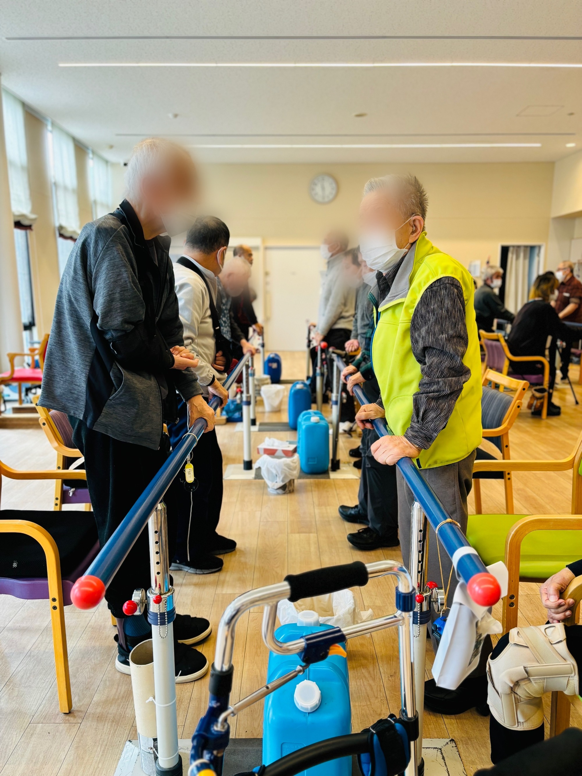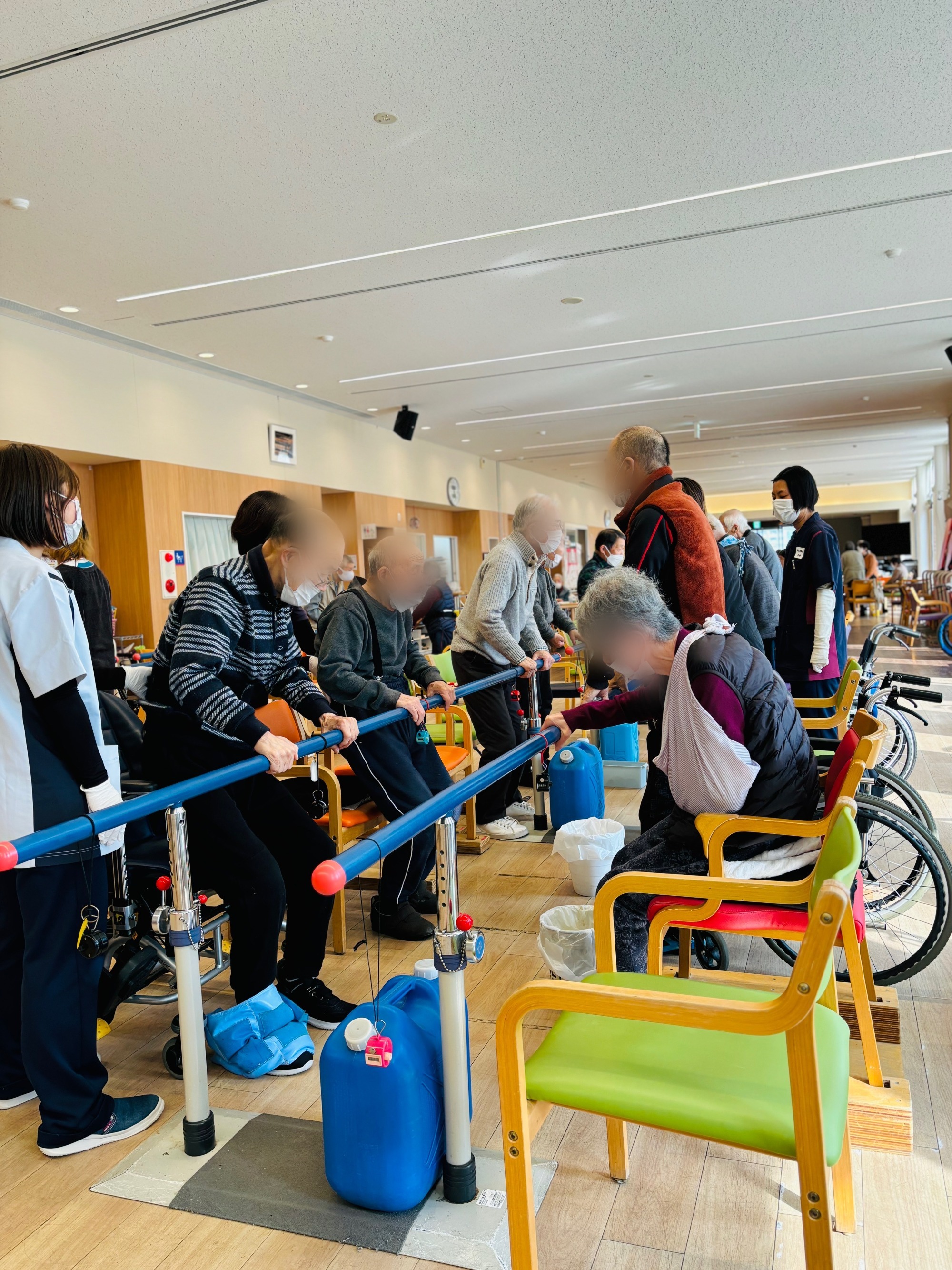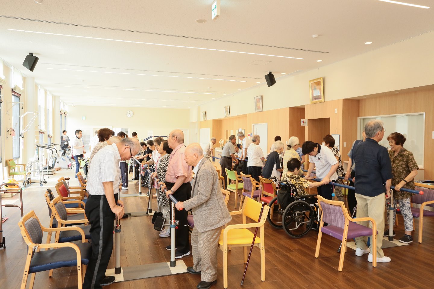 起立ー着席訓練は立ち座りを繰り返すことで足腰を鍛える訓練法です。午前200回、午後200回を目標に行っていますが、みんなで号令をかけ合いながら、1分に5~6回とゆっくりしたペースなのでいつの間にか目標を達成しています。数週間続けると足腰が強くなり体の動きが良くなることを実感できるため、毎日多くの方がリハビリに来られています。
