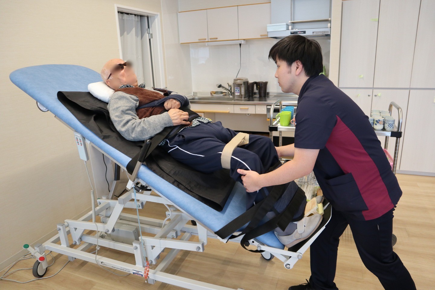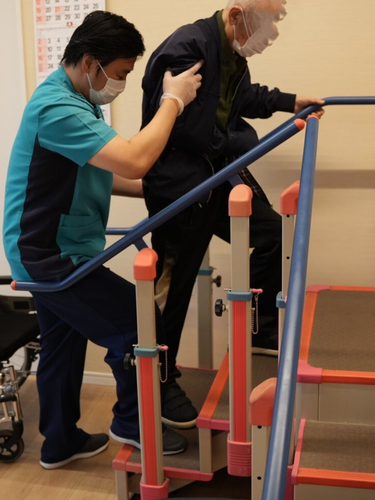 リハビリプログラムは、リハビリで実績のある遠賀郡遠賀町の「羅寿久会 浅木病院」(院長の実家)をお手本としています。訓練効果の高い起立-着席訓練を中心に行っており、さらに、訓練内容を充実させるため、個別訓練(歩行訓練や階段訓練、衣服の着脱・入浴訓練など)を積極的に取り入れています。